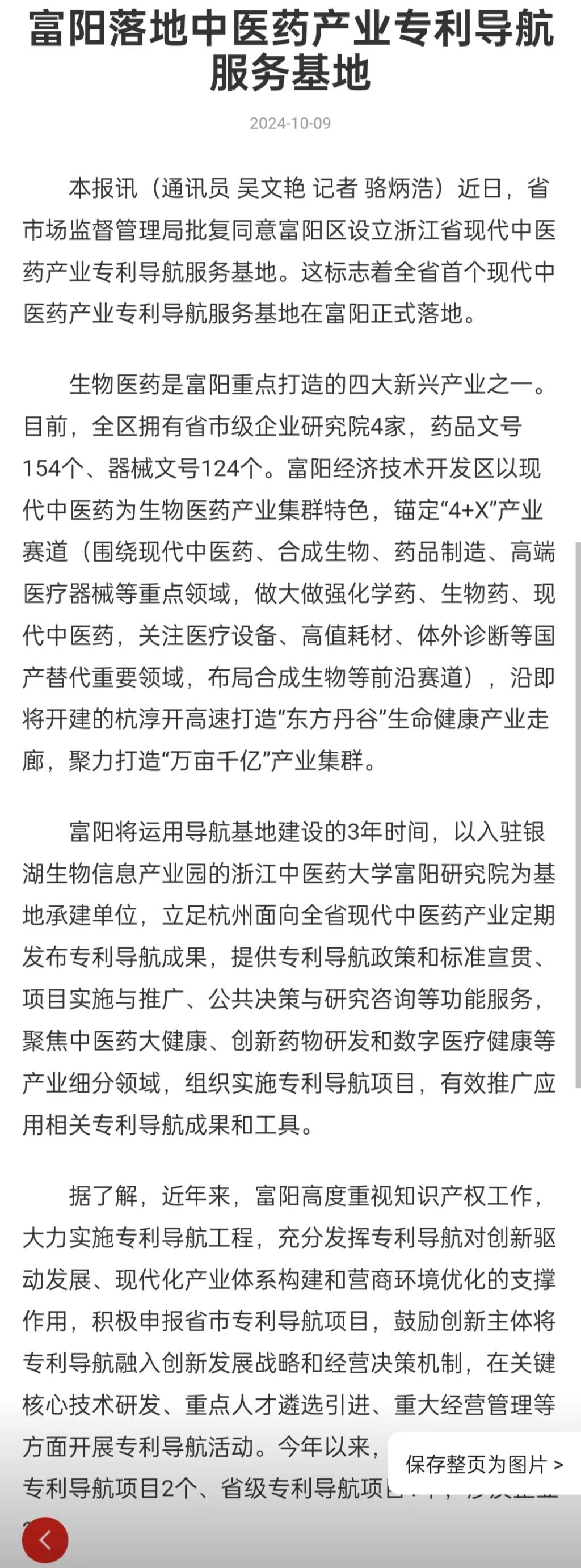 近日,省市场监督管理局批复同意富阳区设立浙江省现代中医药产业专利导航服务基地。这标志着全省首个现代中医药产业专利导航服务基地在富阳正式落地。