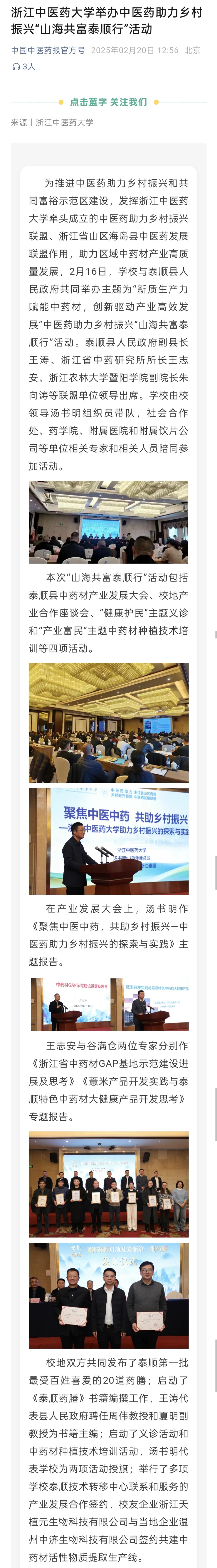 本次活动是学校牵头成立的两个联盟“山海共富行”系列活动之一,下一步将联合更多联盟单位,赴更多山区海岛县开展医疗、科技、产业、文化服务,推进中医药助力乡村振兴行动,切实服务我省两个“先行”示范建设。