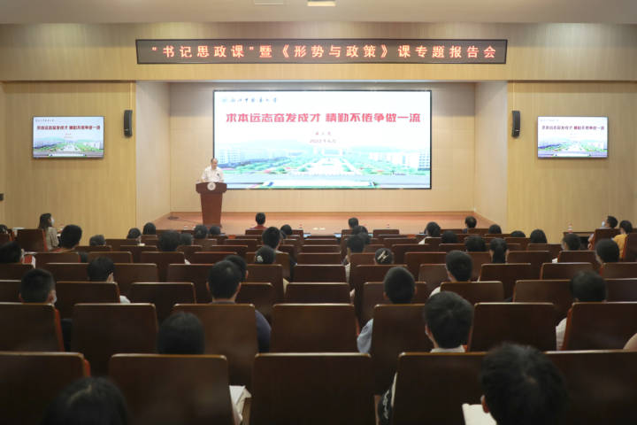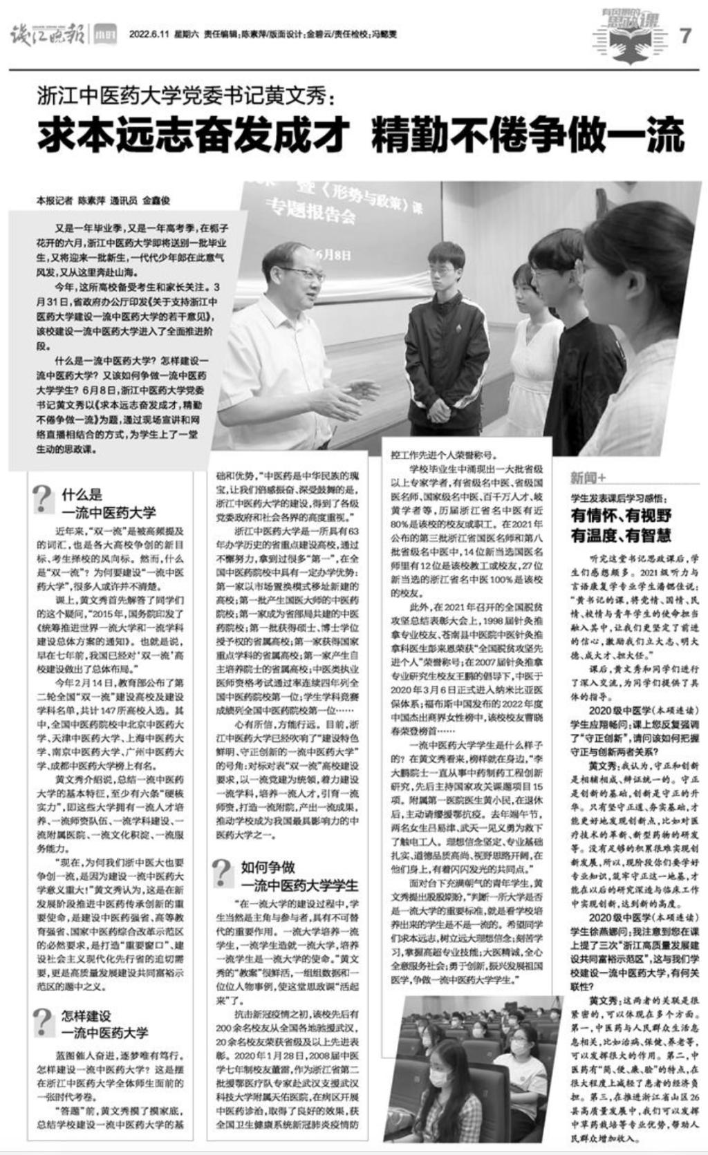 2021级中医学(五年制)专业学生俞倩说:黄书记讲座,饱含深情与厚望。我们将与学校共成长,把‘求本远志’的校训深刻心间,愿以我辈之青春,护卫盛世之中华。”