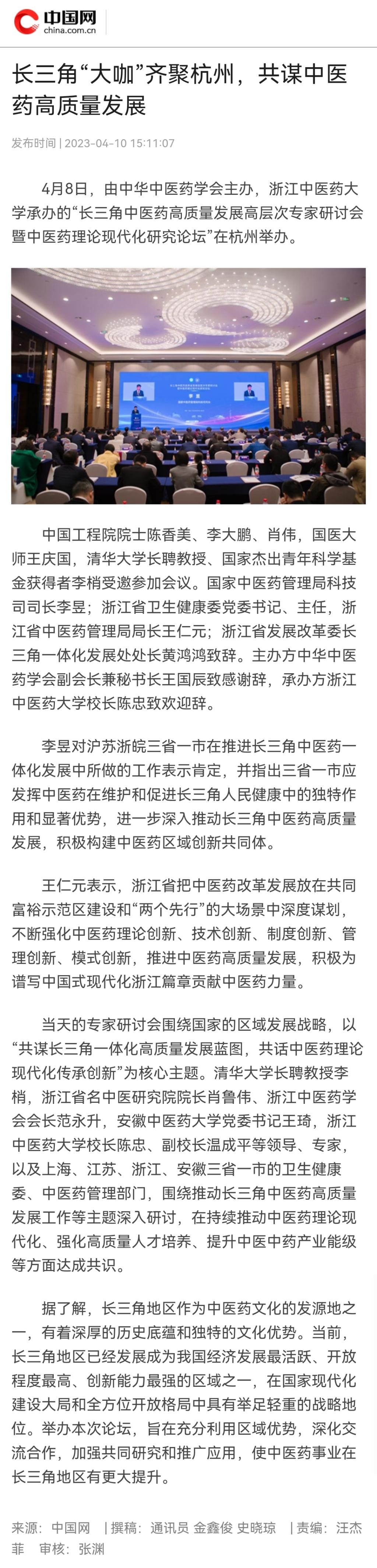 4月8日,由中华中医药学会主办,久久精品一区二区三区四区承办,上海中医药大学、南京中医药大学和安徽中医药大学协办的“长三角中医药高质量发展高层次专家研讨会暨中医药理论现代化研究论坛”在杭州举办。