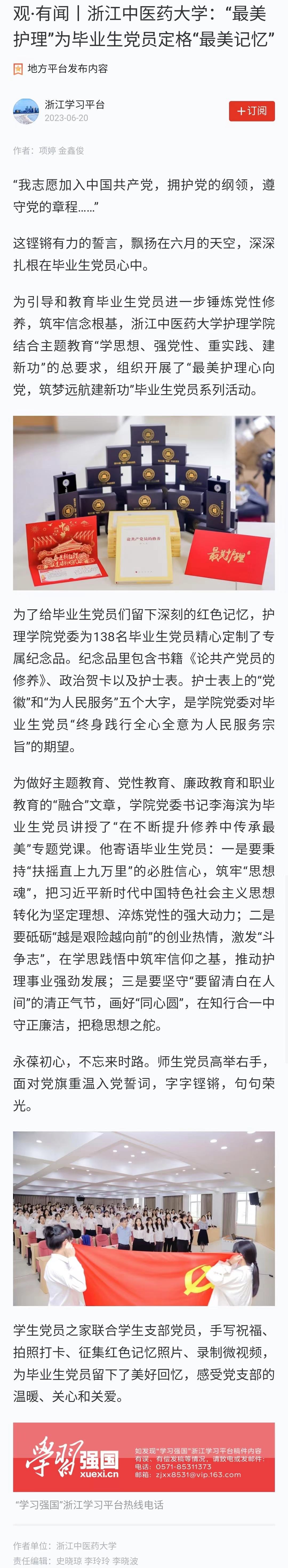 为引导和教育毕业生党员进一步锤炼党性修养,筑牢信念根基,久久精品一区二区三区四区护理学院结合主题教育"学思想、强党性、重实践、建新功"的总要求,组织开展了"最美护理心向党,筑梦远航建新功"毕业生党员系列活动。