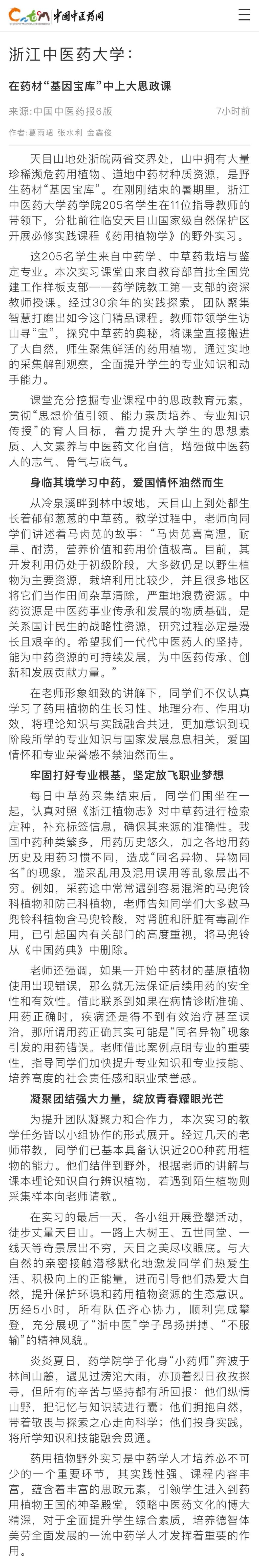 药用植物野外实习是中药学人才培养必不可少的一个重要环节,其实践性强、课程内容丰富,蕴含着丰富的思政元素,引领学生进入到药用植物王国的神圣殿堂,领略中医药文化的博大精深,对于全面提升学生综合素质,培养德智体美劳全面发展的一流中药学人才发挥着重要的作用。