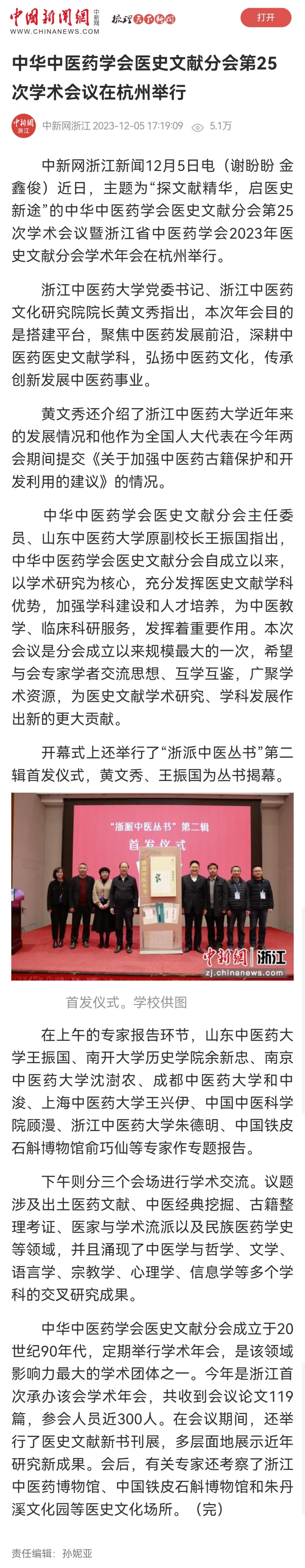 中国新闻网:中华中医药学会医史文献分会第25次学术会议在杭州举行