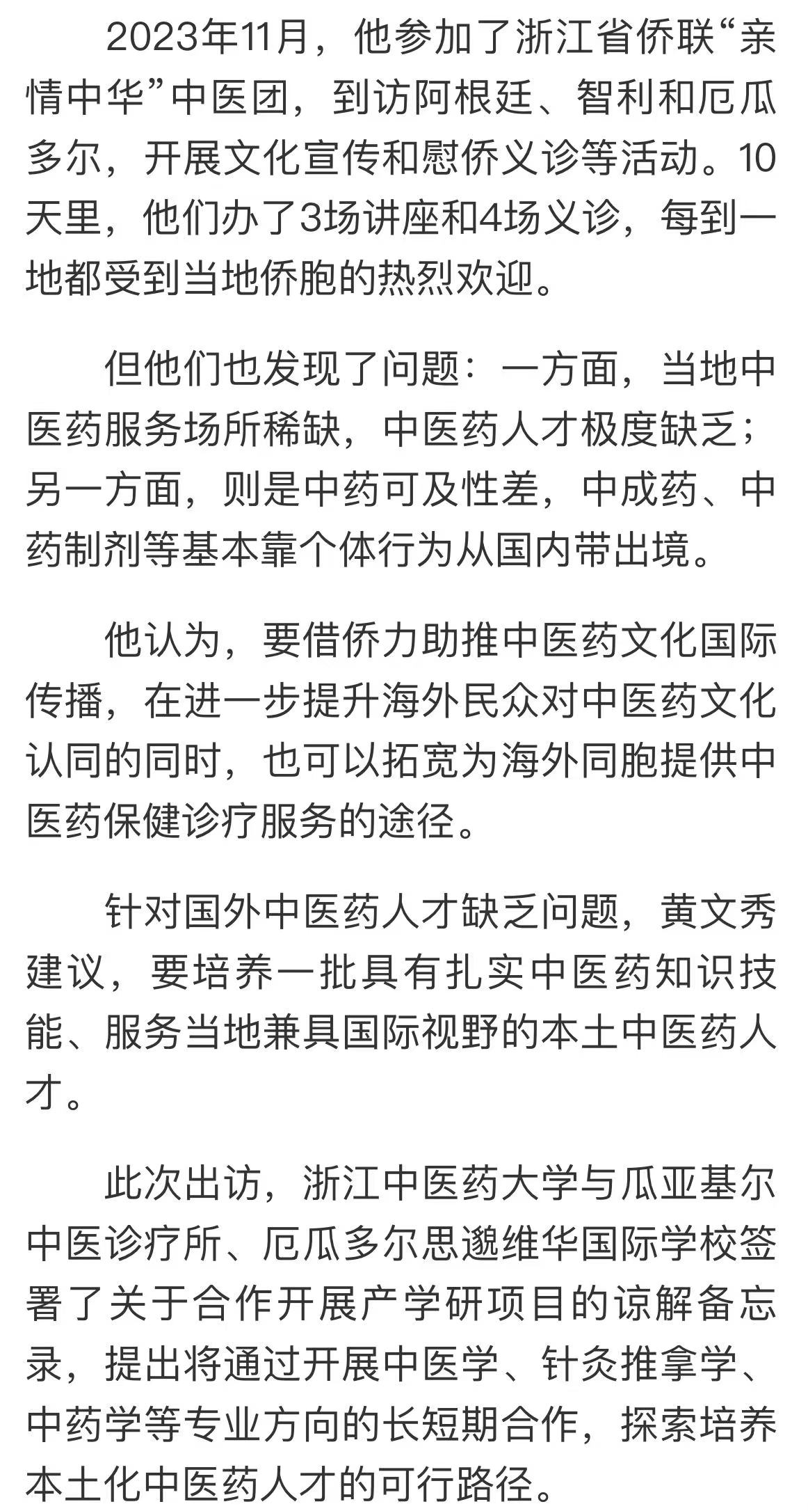 2023年11月,他参加了浙江省侨联“亲情中华”中医团,到访阿根廷、智利和厄瓜多尔,开展文化宣传和慰侨义诊等活动。10天里,他们办了3场讲座和4场义诊,每到一地都受到当地侨胞的热烈欢迎。