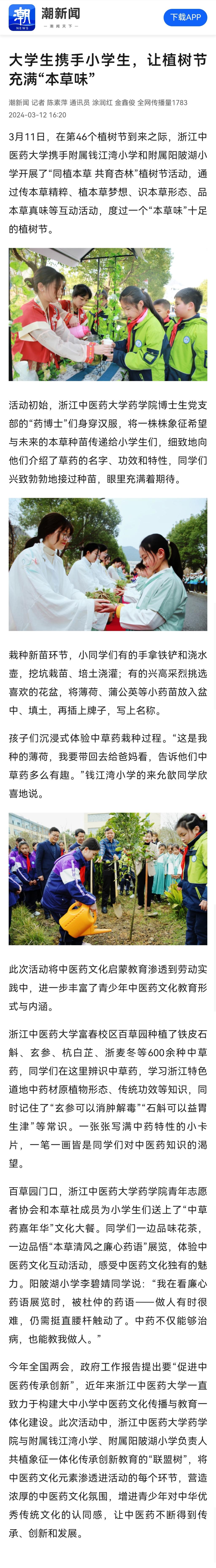 潮新闻:大学生携手小学生,让植树节充满“本草味”