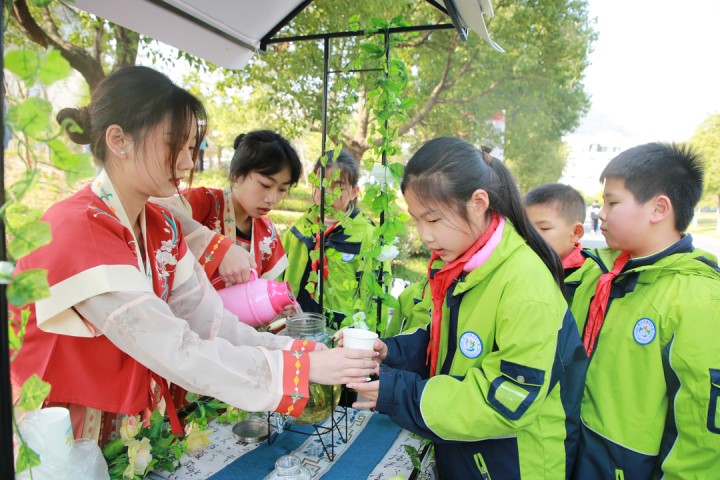 孩子们沉浸式体验中草药栽种过程。“这是我种的薄荷,我要带回去给爸妈看,告诉他们中草药多么有趣。”钱江湾小学的来允歆同学欣喜地说。
