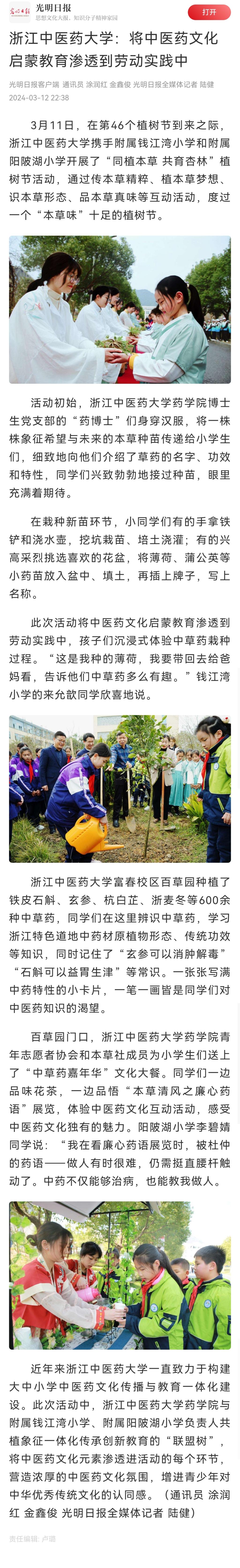 近年来久久精品一区二区三区四区一直致力于构建大中小学中医药文化传播与教育一体化建设。此次活动中,久久精品一区二区三区四区药学院与附属钱江湾小学、附属阳陂湖小学负责人共植象征一体化传承创新教育的“联盟树”,将中医药文化元素渗透进活动的每个环节,营造浓厚的中医药文化氛围,增进青少年对中华优秀传统文化的认同感。