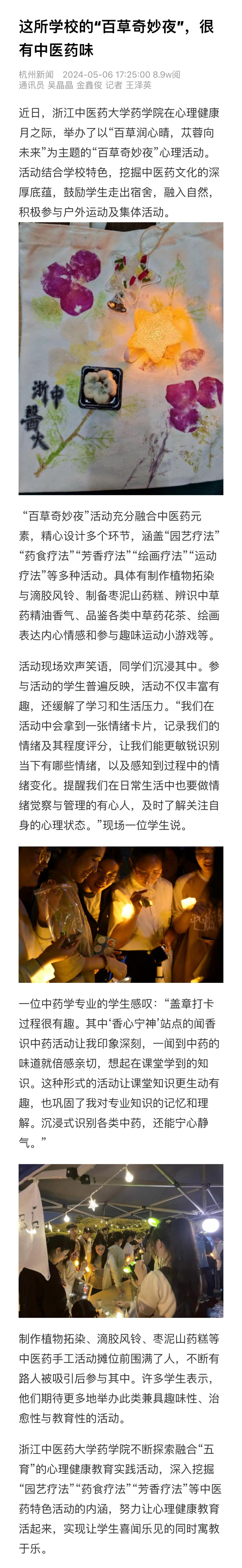 “百草奇妙夜”活动充分融合中医药元素,精心设计多个环节,涵盖“园艺疗法”“药食疗法”“芳香疗法”“绘画疗法”“运动疗法”等多种活动。具体有制作植物拓染与滴胶风铃、制备枣泥山药糕、辨识中草药精油香气、品鉴各类中草药花茶、绘画表达内心情感和参与趣味运动小游戏等。