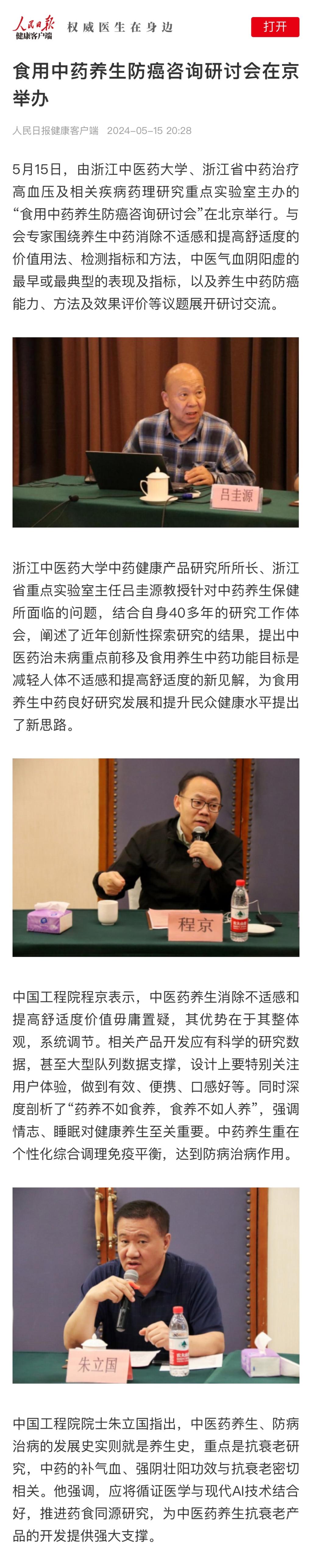 中国工程院院士朱立国指出,中医药养生、防病治病的发展史实则就是养生史,重点是抗衰老研究,中药的补气血、强阴壮阳功效与抗衰老密切相关。他强调,应将循证医学与现代AI技术结合好,推进药食同源研究,为中医药养生抗衰老产品的开发提供强大支撑。